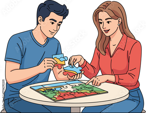 Young couple solving colorful jigsaw puzzle together at home, bonding over fun activity, teamwork, and quality leisure time indoors.
