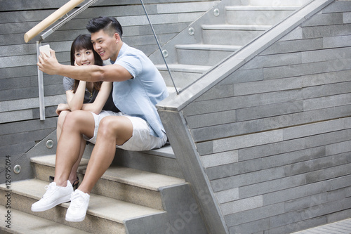 young couple, chinese, asian, dating, photographing, love, bonding, cheerful, romance, boyfriend, girlfriend, step, couple, falling in love, people, two people, missy, woman, female, young men, man, male, asian ethnicity, adult, adults only, young adult, close to, enjoyment, happiness, joy, leisure, avocation, lifestyle, loving, modern, togetherness, mobile phone, technology, wireless technology, casual clothes, short, outdoors, day, building exterior, arms outstretched, looking away, sitting, smiling, toothy smile, china, east asia, asia, beijing, photo, color image, full-length, selective focus, half face, horizontal