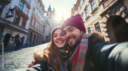 Young couple taking selfie in street with historic buildings in the city of Prague, Czech Republic in Europe.