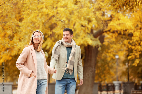 Young couple walking in park on autumn day