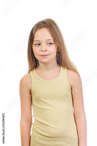 adorable, casual attire, beauty, caucasian, background, childhood, small, beautiful, girl, person, children, little, young, children, pretty, portrait, people, white, isolated, cute, sleeveless, t-shirt, female, fun, funny, happy, smile, cheerful, happiness, joy, positive, long, hair, blue, grey, eye, light, yellow, mystery, crafted