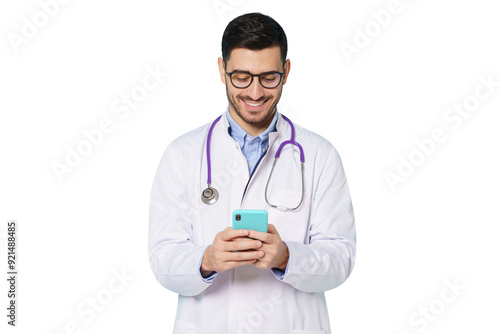 Young doctor in white coat smiling, holding his phone with both hands, using medical app