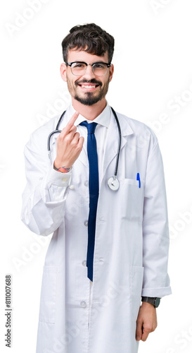 Young doctor man wearing hospital coat over isolated background Beckoning come here gesture with hand inviting happy and smiling