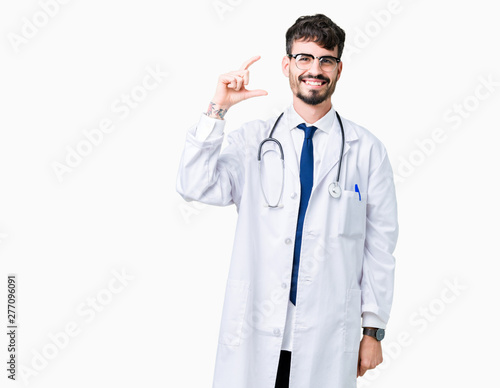 Young doctor man wearing hospital coat over isolated background smiling and confident gesturing with hand doing size sign with fingers while looking and the camera. Measure concept.