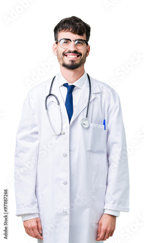 Young doctor man wearing hospital coat over isolated background with a happy and cool smile on face. Lucky person.