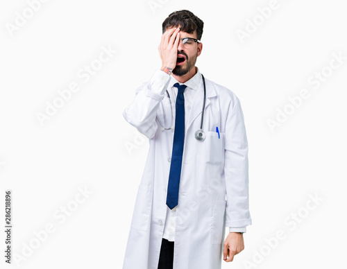Young doctor man wearing hospital coat over isolated background Yawning tired covering half face, eye and mouth with hand. Face hurts in pain.