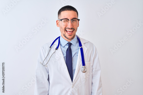 Young doctor man wearing stethoscope over isolated background winking looking at the camera with sexy expression, cheerful and happy face.