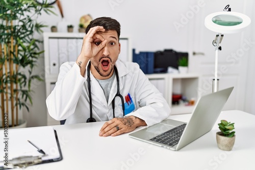 Young doctor working at the clinic using computer laptop doing ok gesture shocked with surprised face, eye looking through fingers. unbelieving expression.