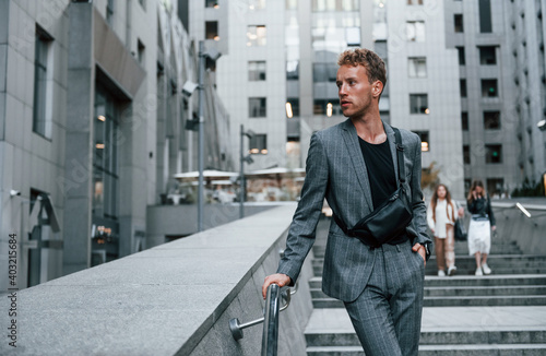 Young elegant man in good clothes is outdoors in the city at daytime