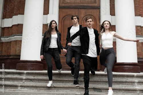 Young elegant trendy friends outdoors, wearing black and white clothing