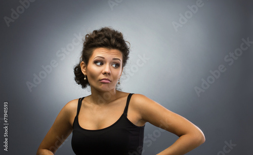expression, face, girl, emotion, thinks, haughty, arrogance, serious, frustrated, care, young, attractive, 1, person, woman, fresh, clean, honed, isolated, front, coiffure, curl, caucasian, brunette, female, portrait, cosmetic, beauty, background, eye, model, sad, make-up, youth, thought, contempt, scorn, sexy, black, grey, interrogative, question, casual attire, top, tank top