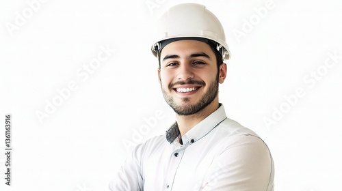 young, engineer, portrait, smiling, confident, male, professional, hard hat, construction, workplace, indoor, casual attire, cheerful, friendly, happy, photogenic, business, safety-gear, light background, communication, innovation, creativity, achievement, skill, dedication, motivation, success, enthusiasm, expertise, career, professionalism, leadership, vision, goal, ambition, design, technology, collaboration, engineering, project, strategy, development, solution, support, future, inspiration, growth