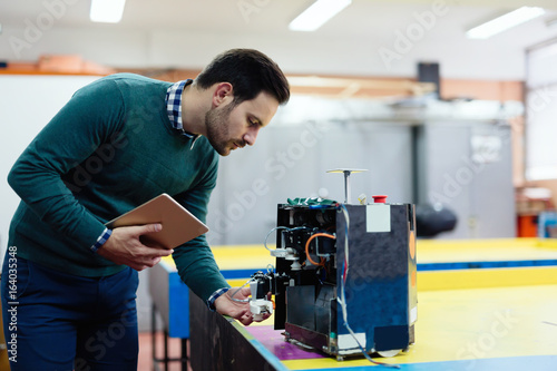 Young engineer testing his robot in workshop