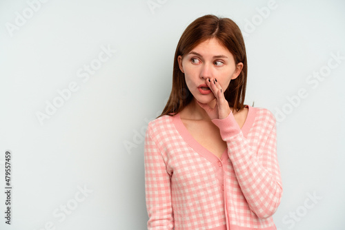 Young English woman isolated on blue background being shocked because of something she has seen.