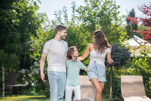 touch, hugs, communication, nature, fresh air, schoolboy, childhood, parenthood, mother, warm, lifestyle, family, day off, hand, boy, cute, outdoors, casual attire, well-being, holding, vacation, father, sunlight, joyful, caucasian, mood, caring, style, weekend, long-haired, happy, day, man, together, cheerful, children, woman, standing, young, smile, smiling, dark-haired, adult, pastime, three, loving