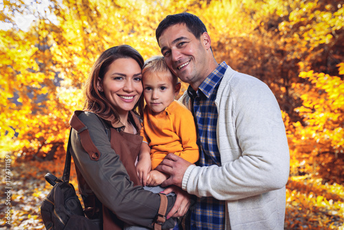 Young family with little son in autumn park on sunny day. Family autumn portrait
