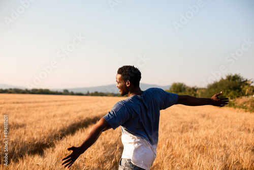 yellow, beauty, meadow, landscape, african, organic, traditional, growth, adult, farming, young, agriculture, man, sunny, food, grow, nature, lifestyle, black, field, natural, season, cereal, sunlight, agricultural, tranquil, harvest, view, straw, plant, gold, happiness, cultivated, summer, mental health, person, descent, wheat, culture, freedom, happy, human, farmer, crop, countryside, portrait