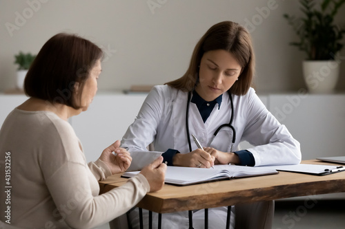 Young female doctor or therapist write prescription consult mature patient at meeting in clinic. Caucasian woman GP note complaints in medical journal at consultation with senior client in hospital.