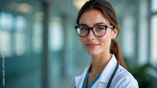 young female doctor wearing glasses and holding a stethoscope smiles in a hospital corridor