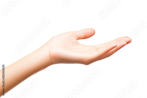 thumb, person, female, woman, open, showing, wrist, arm, assistance, carrying, finger, gentle, gesture, give, hold, human, manicure, offer, palm, presenting, show, signs, skin, up, stretched, blank, body, empty, isolated, space, take, white, young, cut-out, gesticulate