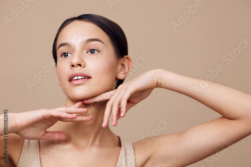 Young female model with natural beauty poses gracefully against a neutral background, showcasing healthy skin, elegance, and serenity in her expression