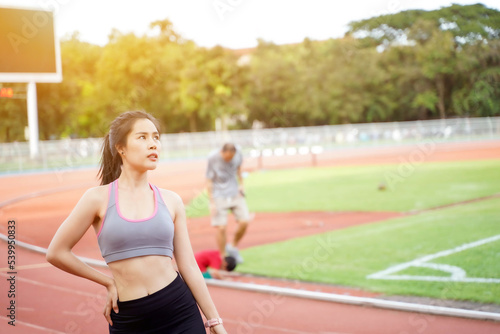 Young female relaxing after fitness training at the football stadium in the morning with sunbeam.