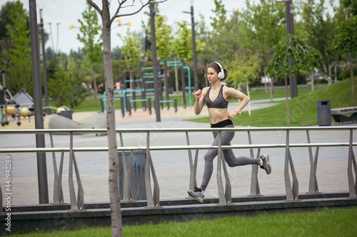 Young female runner, athlete is jogging in the city street in spring sunshine. Beautiful caucasian woman training, listening to music. Concept of sport, healthy lifestyle, movement, activity.