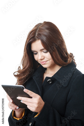 female, using, reading, tablet, beautiful, black, brown, brunette, caucasian, coat, communication, dark-haired, generation, girl, hair, holding, indoor, isolated, long, long-haired, looking, 1, people, smiling, studio, teenage, teenage, teenage, waist up, white, white background, young