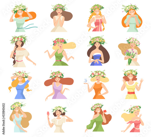 Young Female with Splendid Hair Having Floral Wreath on Her Head Big Vector Set
