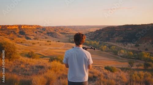 Young filmmaker capturing scenic landscapes with a drone at golden hour, creating captivating cinematic visuals