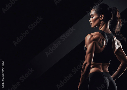athletic, young, woman, fit, athlete, fitness, gym, strength, beautiful, coach, abs, training, banner, sportive, exercising, physique, person, sport, club, confident, exercise, horizontal, indoor, instructor, lifestyle, model, motivation, muscle, muscular, personal, photo, physical, power, professional, strong, trainer, weight, bicep, bodybuilder, bodybuilding, brunette, photo, black, poster, background, space, text, ai, generative