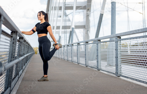 Young fitness woman in black sport outfit preparing for a run stretching her muscles at bridge.