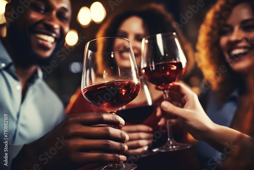 Young friends drinking alcohol and toasting glass of wine in restaurant