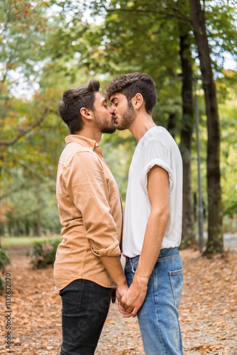 young, gay, couple, kissing, autumn, park, copy space, people, adult, man, autumn, standing, leisure, casual attire, bonding, opposite, closed, eye, tree, autumn leaf, city, partnership, love, lover, outdoors, nature, teenage, italy, holding, hand, togetherness, twosome, human relationships, leaf, caucasian, male
