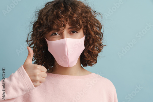 woman, adult, young, white, portrait, mask, face, pandemic, thumb, gesture, show, look, ginger, red, curly, studio, indoor, 1, people