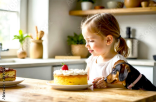 girl, cake, dog, kitchen, dessert, afternoon, smiling, cosy, playful, home, food, children, pet, sweet, whipped, cream, family, joy, warmth, strawberry, curiosity, snack, baking, friendship, treat, happiness, indoor, celebration, plate, dining, adorable, table, lifestyle, companionship, love, exploration, children, decor, wooden, culinary, treat, cute, moment, enjoyment, excitement, gaze, admire, blur, blurred