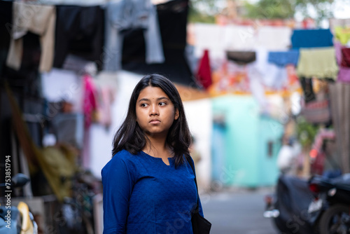 black hair, daylight, dress, face, facial expression, girl, hair, head, portrait, road, street, traditional, urban, young
