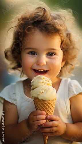 Young girl indulging in ice cream at a bustling city park with an ideal area for adding custom text
