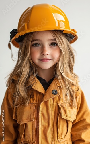 Young girl wearing construction helmet and jacket: embracing future builders and gender equality in stem fields