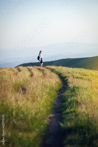 mountain, girl, young, freedom, trail, hill, woman, travel, summer, path, traveler, beautiful, grass, field, calm, peace, slim, teenage, walk, female, journey, adventure