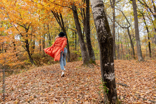 Young girl with blond hair walks in the autumn forest. Wellness concept.
