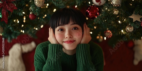 girl, children, young, children, christmas, tree, decoration, festive, holiday, winter, snowflake, present, gift, wrapping, paper, red, green, light, ornament, joyful, happy, smiling, portrait, indoor, home, family, celebration