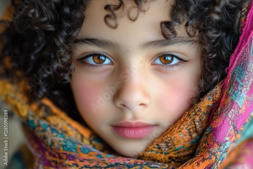Young girl with curly hair and warm brown eyes wrapped in a colorful scarf in soft lighting