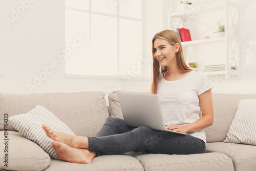 attractive, beautiful, blond, candid, casual attire, caucasian, emotional, female, girl, happy, home, indoor, interior, leisure, lifestyle, long-haired, person, pretty, real, rest, room, sofa, woman, young, cheerful, communication, couch, device, contraption, cyberspace, looking, network, online, technology, copy space, computer, laptop, white, typing, cute, house, alone, barefoot beach, beauty, comfortable, daylight, student, window, working
