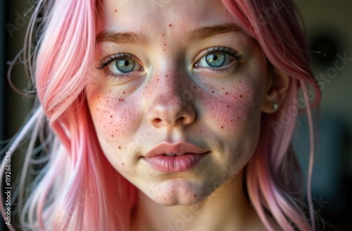 young girl with pink hair and freckles gazing intently at camera. close up portrait showcasing unique beauty. fashion and lifestyle, individuality