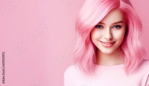 young, girl, pink, hair, background, woman, beauty, blond, face, smile, blond, smiling, fashion, person, model, skin, natural, fresh, people, studio, care, coiffure, lady, make-up, 1, lip, looking, closeup