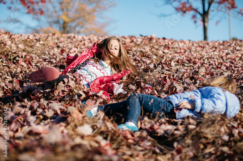 Young girls playing in leaves outside