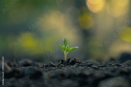 Young green seedling sprouting from soil in soft natural light, surrounded by a blurred bokeh background. Representation of growth, renewal, and sustainability.
