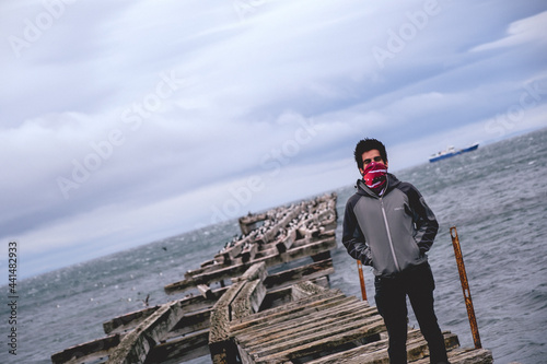 Young guy with bandana in a cloudy day in an old dock with seagulls and birds in the Estrecho de Magallanes (Strait of Magellan), Punta Arenas, Chile