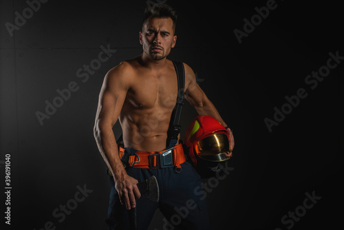 young handsome adult, muscular firefighter in uniform holding ax of fire equipment in his hands, pensive, isolated on dark background. Low key. Protection concept. there is a place for an inscription